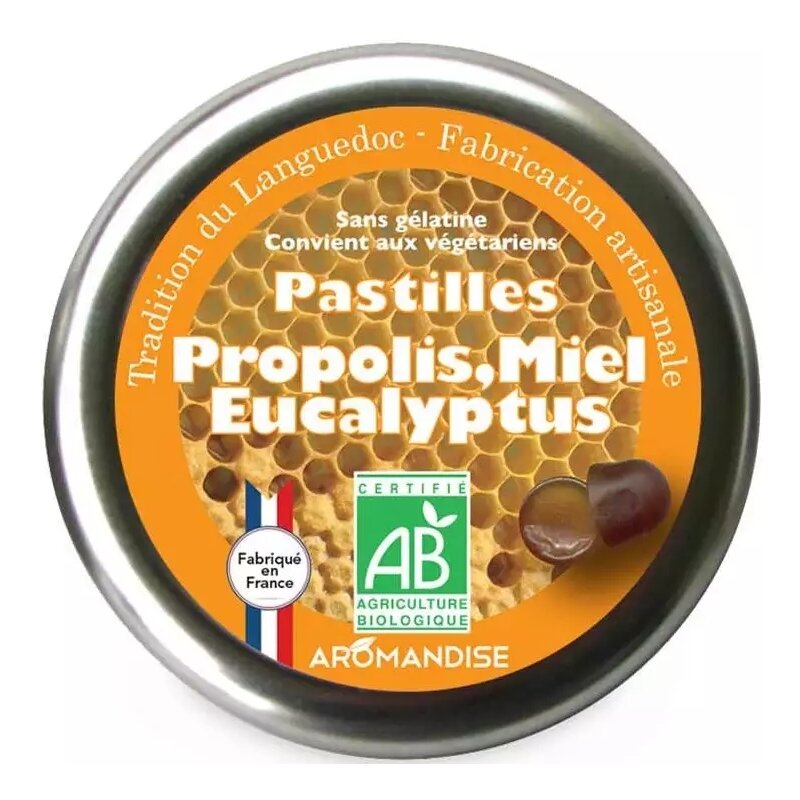 Amestecul de Miere, Propolis și Eucalipt oferă pastilelor un gust rășinos sporit de Eucalipt camforat și dulceața mierii. Perfect pentru lunile de iarnă dar nu numai! Pastile gourmet! Gama este realizată manual, conform tradițiilor și know-how-ului din Languedoc. Aceste bomboane gurmande organice sunt fără gelatină animală.