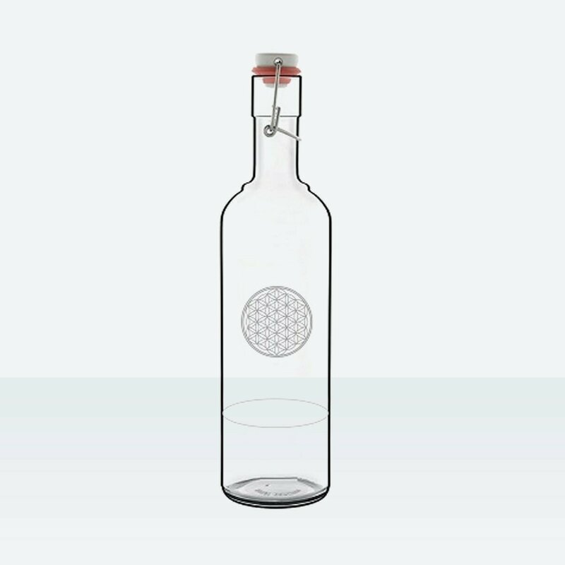 Sticla transparenta din cristal, de inalta calitate, este groasa si garantat fara plumb. Acest produs este creat de sticlarul Luigi Bormioli. Aceasta sticla este personalizata cu un nivel de umplere de 25% pentru a facilita tranzitia de la hipertonic la izotonic, precum si o floare a vietii pentru a energiza apa de mare izotonica. Floarea vietii este o imagine geometrica considerata sacra, avand o multime de beneficii, datorita fortei sale vibratorii si energetice. Este indicata armonizarea apei de mare si mentinerea ritmului vibratoriu ridicat al acesteia. Utilizati de preferinta apa de izvor sau osmoza pentru a va prepara amestecul. In caz contrar, apa minerala imbuteliata trebuie sa aiba un numar de reziduuri uscate mai mic de 100 mg/L