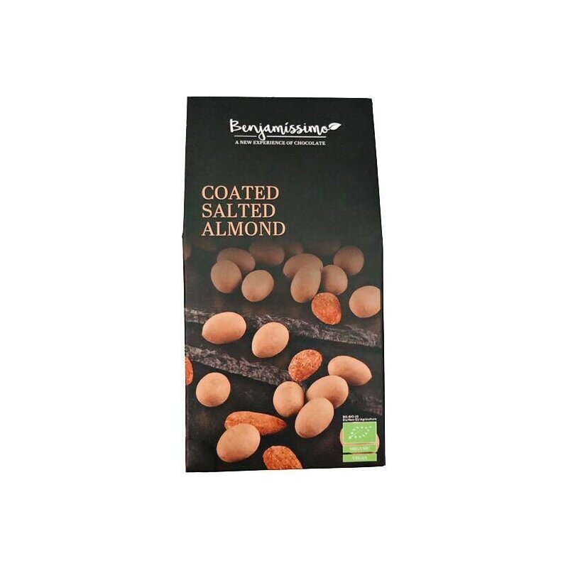 Migdale intregi prajite invelite in ciocolata Benjamissimo cu caramel sarat. Gustoase si crocanta, facuta din 100% ingrediente organice.