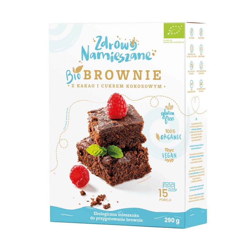 Mixul pentru brownies cu cacao si zahar de cocos Zdrowo Namieszane nu contine faina de grau. In schimb, veti gasi fainuri sanatoase fara gluten, fulgi de ciocolata neagra, cacao si seminte de in. Incearca-l si vezi cat de usor si rapid poti pregati o prajitura Brownie de care cei dragi vor fi incantati!
