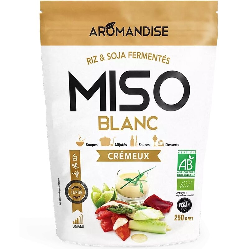 Pasta Miso alba este ideala pentru supe, sosuri albe, sosuri pentru salate sau chiar deserturi! Gustul său de umami foarte ușor sărat, aproape dulce și textura sa cremoasă îl fac un aliat perfect pentru preparatele tale vegetale pentru a înlocui cremele, bulionul și untul!